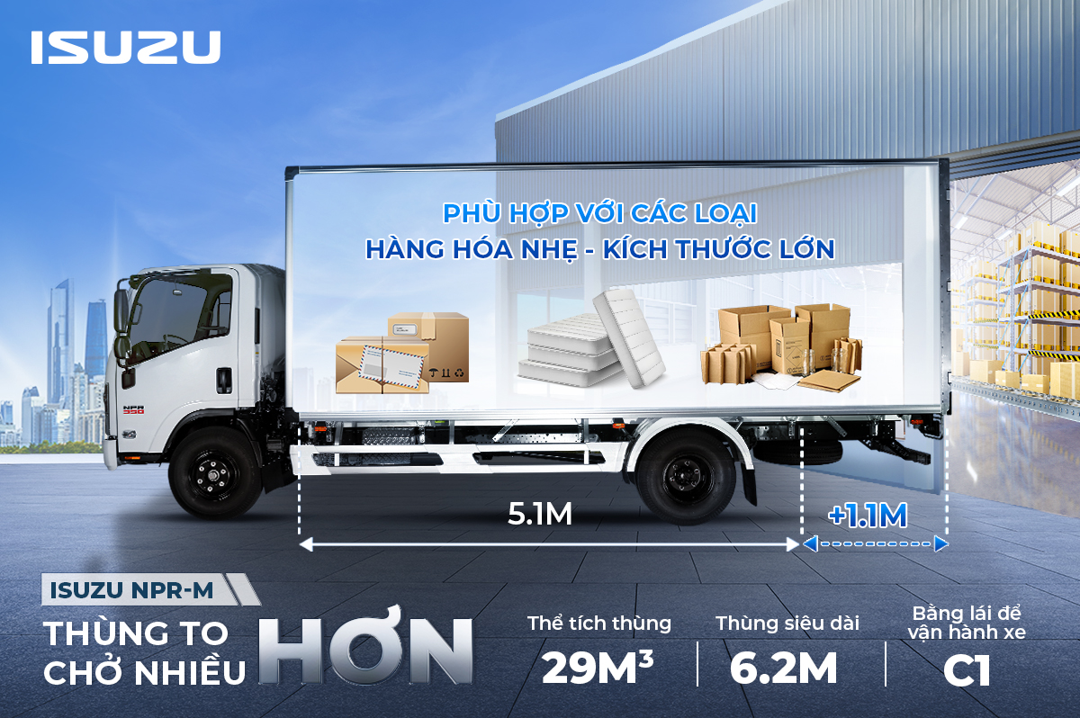 Xe tải Isuzu NPR85ME5 3T5 thùng dài 6m2 là dòng xe tải tầm trung thuộc phân khúc N-Series của thương hiệu Isuzu – Nhật Bản. Với thiết kế bền bỉ, tiết kiệm nhiên liệu, tải trọng 3.5 tấn và chiều dài thùng lên đến 6.2 mét, mẫu xe này là sự lựa chọn lý tưởng cho các doanh nghiệp vận tải cần sự linh hoạt trong khu vực nội thành lẫn ngoại ô, đặc biệt phù hợp với việc vận chuyển hàng hóa cồng kềnh hoặc khối lượng lớn.